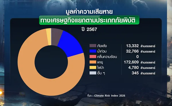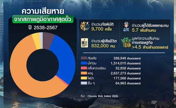 โลกเผชิญผลกระทบจากการเปลี่ยนแปลงสภาพภูมิอากาศรุนแรงและบ่อยครั้งมากขึ้น ไม่ว่าจะเป็นน้ำท่วมใหญ่ ไฟป่ารุนแรง พายุพลังทำลายล้างสูง หรือวิกฤตคลื่นความร้อนที่ทำสถิติใหม่อย่างต่อเนื่อง จนกลายเป็นเหตุการณ์ปกติ ไม่ใช่นาน ๆ ทีถึงจะเกิดขึ้น ข้อมูลจากรายงานดัชนีความเสี่ยงด้านสภาพภูมิอากาศ ประจำปี 2569 (Climate Risk Index-CRI 2026) ที่เผยแพร่โดย “เยอรมันวอตช์” (Germanwatch) ซึ่งติดตามเรื่องการเปลี่ยนแปลงด้านสภาพภูมิอากาศโลกและจัดอันดับความเสี่ยงของ 174 ประเทศทั่วโลก ระบุว่า ในระหว่างปี 2538-2567 เกิดภัยพิบัติจากสภาพอากาศสุดขั้ว (extreme weather) มากกว่า 9,700 ครั้ง คร่าชีวิตผู้คนทั่วโลกกว่า 832,000 คน ส่งผลกระทบต่อประชากรเกือบ 5.7 พันล้านคน และสร้างความเสียหายทางเศรษฐกิจสูงกว่า 4.5 ล้านล้านดอลลาร์ ซึ่งเป็นตัวเลขที่ปรับตามอัตราเงินเฟ้อแล้ว