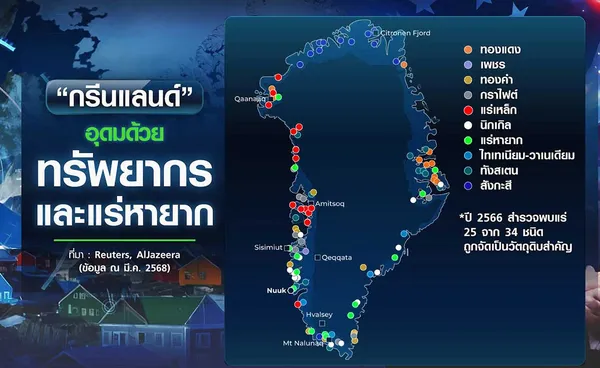 แหล่งแร่หายากขนาดใหญ่สุด 3 แห่งของ “กรีนแลนด์” ตั้งอยู่ทางตอนใต้ของเกาะ โดยมีบริษัทต่าง ๆ เข้าสำรวจพื้นที่ ซึ่งแร่หายากเหล่านี้มีความสำคัญต่ออุตสาหกรรม EV และกังหันลม ส่วนกราไฟต์ที่ใช้ในแบตเตอรี่รถ EV และการผลิตเหล็กกระจายอยู่ทั่วไป สำหรับทองแดงและนิกเกิลยังไม่ได้มีการสำรวจจริงจัง ด้านสังกะสีส่วนใหญ่พบในทางตอนเหนือของเกาะ บริเวณอ่าวซิโทรเนนเป็นหนึ่งในแหล่งแร่สังกะสี-ตะกั่วที่ยังไม่ได้พัฒนาขนาดใหญ่สุดในโลก นอกจากนี้ พื้นที่ทางตอนใต้รอบอ่าวแซร์มิลิการ์ซุกเป็นแหล่งแร่ทองคำสำคัญ ขณะที่กรีนแลนด์ยังมีแหล่งแร่เหล็ก เพชร ไทเทเนียม วานาเดียม ทังสเตน และยูเรเนียม ทั้งหมดนี้ทำให้กรีนแลนด์กลายเป็นจุดสนใจของประเทศต่าง ๆ ที่ต้องการแร่หายากเหล่านี้ โดยเฉพาะสหรัฐฯ ที่ต้องการแหล่งทรัพยากรใกล้บ้าน