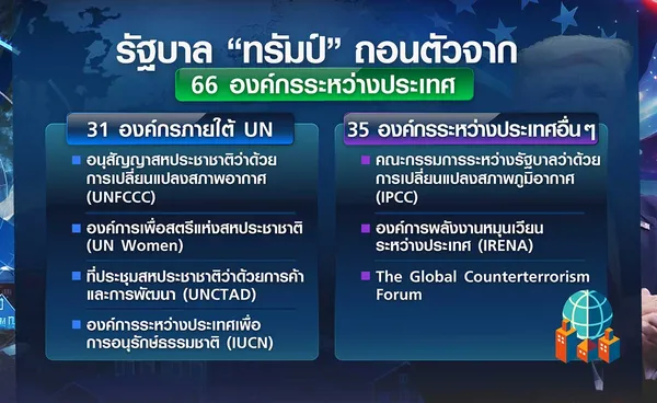 ล่าสุด “สหรัฐฯ” ประกาศถอนตัวจากองค์กรระหว่างประเทศ 66 แห่ง ซึ่งรวมถึงเวทีด้านความร่วมมือเกี่ยวกับการเปลี่ยนแปลงสภาพภูมิอากาศ การสร้างสันติภาพและประชาธิปไตย โดยความเคลื่อนไหวดังกล่าวเกิดขึ้นหลังรัฐบาล “ทรัมป์” ทบทวนว่า องค์กร อนุสัญญา และสนธิสัญญาใดบ้างที่ขัดต่อผลประโยชน์ของสหรัฐฯ ซึ่งจะทำให้สหรัฐฯ ยุติการเข้าร่วมและตัดงบประมาณสนับสนุนทั้งหมดให้กับองค์กรต่าง ๆ ที่เคยเข้าร่วม