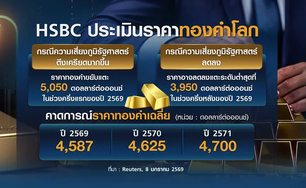 ทั้งนี้ นักวิเคราะห์จากธนาคาร HSBC ประเมินเมื่อสัปดาห์ที่ผ่านมา (8 มกราคม)ว่า ความเสี่ยงจากภูมิรัฐศาสตร์ที่ตึงเครียดมากขึ้นจะผลักให้ราคาทองคำขยับแตะ 5,050 ดอลลาร์ต่อออนซ์ ในช่วงครึ่งแรกของปี 2569 เพิ่มขึ้นจากที่เคยคาดการณ์ไว้ก่อนหน้านี้ที่ 5,000 ดอลลาร์ แต่อาจมีการปรับลดลงในช่วงครึ่งหลังของปี โดยอาจลดลงแตะระดับต่ำสุดที่ 3,950 ดอลลาร์ต่อออนซ์ หากความเสี่ยงด้านภูมิรัฐศาสตร์ลดลง หรือธนาคารกลางสหรัฐฯ (เฟด) ยุติการลดอัตราดอกเบี้ย