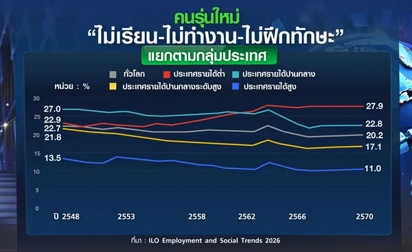 ในขณะที่สัดส่วนของคนรุ่นใหม่ที่ไม่ได้เรียน ไม่ได้ทำงาน หรือไม่ได้รับการฝึกอบรมทักษะ (Not in Education, Employment, or Training-NEET) ในปี 2568 อยู่ที่ร้อยละ 20 เพิ่มขึ้นจากร้อยละ 19.9 ในปีก่อนหน้า ซึ่งเท่ากับคนรุ่นใหม่ทั่วโลก 257 ล้านคนพลาดโอกาสในการได้รับความรู้และประสบการณ์ที่จะเข้าสู่ตลาดแรงงานในอนาคต น่าสังเกตว่า คนรุ่นใหม่ที่อยู่ในภาวะ NEET พลิกกลับมาอยู่ในขาขึ้นอีกครั้ง หลังจากปี 2566 ที่แตะระดับต่ำสุดที่ร้อยละ 19.7 และคาดว่าแนวโน้มจะเพิ่มขึ้นต่อเนื่องไปจนถึงปี 2570 ซึ่งถือเป็นเรื่องที่น่ากังวล โดยเฉพาะในกลุ่มประเทศที่มีรายได้ต่ำ ซึ่งอัตรา NEET ของคนรุ่นใหม่มีแนวโน้มแตะร้อยละ 27.9 ในปี 2570 สูงกว่ากันถึงร้อยละ 17 เมื่อเทียบกับประเทศรายได้สูงที่มีแนวโน้มอยู่ที่ร้อยละ 11.0