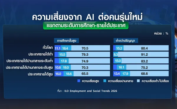 เมื่อไม่นานมานี้ทั่วโลกเริ่มเกิดความกังวลเกี่ยวกับการใช้งานปัญญาประดิษฐ์ (AI) ที่อาจส่งผลกระทบต่อแรงงานรุ่นใหม่ โดยเฉพาะผู้ที่กำลังมองหางานทักษะสูงเป็นครั้งแรกในชีวิตการทำงาน โดยในกรณีของประเทศที่มีรายได้สูง มีข้อมูลสะท้อนว่า คนรุ่นใหม่อายุ 15-24 ปีที่มีการศึกษาสูงอาจเผชิญกับความยากลำบากมากขึ้นในการเข้าสู่ตลาดงาน เนื่องจากการใช้งาน AI เพราะคนกลุ่มนี้มีความเสี่ยงจะถูกแทนที่ด้วยระบบอัตโนมัติมากกว่ากลุ่มคนที่มีการศึกษาในระดับต่ำกว่า แม้ว่าผลกระทบทั้งหมดจาก AI ต่อการจ้างงานคนรุ่นใหม่ยังไม่สามารถประเมินได้แน่นอน แต่ก็ควรจับตามองอย่างใกล้ชิดเกี่ยวกับขนาดของผลกระทบที่อาจเกิดขึ้นตามมา