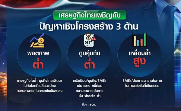ขณะที่ในมุมมองของผู้ว่าการธปท. “นายวิทัย รัตนากร” คาดว่าเศรษฐกิจไทยปี 2569 และ 2570 จะโตต่ำกว่าศักยภาพ เนื่องจากเศรษฐกิจไทยกำลังเผชิญปัญหาเชิงโครงสร้าง 3 ด้าน คือ “ผลิตภาพต่ำ” ส่งผลต่อความสามารถในการแข่งขันและการปรับตัวของธุรกิจ