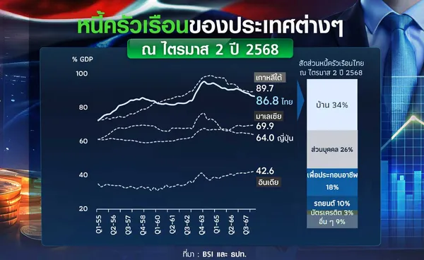 นอกจากนี้ “หนี้ครัวเรือนไทยที่อยู่ระดับสูง” โดยเมื่อเปรียบเทียบสัดส่วนหนี้ครัวเรือนไทยต่อ GDP กับประเทศต่างๆ ณ ไตรมาส 2 ปี 2568 พบว่าสัดส่วนหนี้ครัวเรือนไทยต่อ GDP อยู่ที่ร้อยละ 86.6 สูงกว่าประเทศมาเลเซีย ญี่ปุ่น และอินเดีย ยกเว้นเกาหลีใต้ที่สูงกว่าไทย