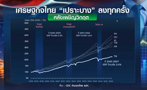 ปัญหาเศรษฐกิจไทยเติบโตต่ำสร้างความกังวลให้หลายฝ่ายทั้งภาครัฐและเอกชน เนื่องจากนับตั้งแต่วิกฤตโควิด เศรษฐกิจไทยฟื้นตัวช้าและเติบโตต่ำที่สุดในอาเซียน และอัตราการเติบโตชะลอลงเฉลี่ยอยู่ที่ร้อยละ 2.4 ต่ำกว่าช่วงหลังวิกฤตแฮมเบอร์เกอร์ที่ขยายตัวเฉลี่ยที่ร้อยละ 3.6 และร้อยละ 5.3 หลังวิกฤตต้มยำกุ้ง สะท้อนถึงภาวะเศรษฐกิจไทยเปราะบางลงทุกครั้งหลังเผชิญวิกฤต และมองไปข้างเศรษฐกิจไทยยังขยายตัวชะลอลงและเติบโตต่ำกว่าศักยภาพ ทั้งนี้ ธนาคารแห่งประเทศไทย (ธปท.) ประเมินว่าในปี 2568-2573 ศักยภาพการเติบโตของเศรษฐกิจไทยเฉลี่ยอยู่ที่ร้อยละ 2.7