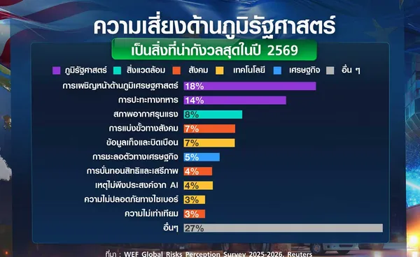 รายงานผลสำรวจ Global Risks Report ประจำปี 2569 ของ World Economic Forum (WEF) ที่สอบถามความเห็นของผู้เชี่ยวชาญและผู้นำทั่วโลกกว่า 1,300 คน และเผยแพร่ก่อนหน้าการประชุมประจำปีที่เมืองดาวอสที่กำลังจะเริ่มต้น ระบุว่า การเผชิญหน้าทางเศรษฐกิจระหว่างประเทศต่าง ๆ นับเป็นความกังวลอันดับ 1 แทนที่ความขัดแย้งทางอาวุธ โดยราวครึ่งหนึ่งของผู้ตอบแบบสอบถาม มองว่า โลกน่าจะเผชิญช่วงเวลาที่ผันผวนในช่วง 2 ปีข้างหน้า และมีเพียงร้อยละ 1 เท่านั้นที่คาดว่าจะมีช่วงเวลาที่สงบสุข สะท้อนว่าโลกกำลังอยู่ริมขอบเหวของความไม่แน่นอน