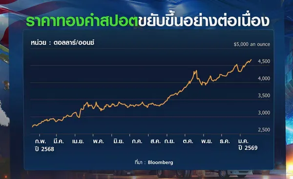 ท่ามกลางสถานการณ์ทางภูมิรัฐศาสตร์และเศรษฐกิจที่ไม่แน่นอน หลังจากประธานาธิบดีทรัมป์ประกาศเก็บภาษี 8 ชาติยุโรป ส่งผลให้ราคา “ทองคำ” พุ่งแตะระดับสูงสุดใหม่เพียงไม่กี่วันหลังจากทำลายสถิติเดิม เนื่องจากนักลงทุนแห่ลงทุนในสินทรัพย์ปลอดภัย โดยเมื่อวานนี้สัญญาซื้อขายทองคำล่วงหน้าสำหรับเดือนกุมภาพันธ์ในตลาดสหรัฐฯ ปรับขึ้นร้อยละ 1.71 สู่ระดับ 4,674.20 ดอลลาร์ต่อออนซ์ หลังจากแตะระดับสูงสุดเป็นประวัติการณ์เมื่อสัปดาห์ที่แล้ว ส่วนราคาทองคำสปอตขยับขึ้นร้อยละ 1.6 อยู่แถว 4,668.14 ดอลลาร์ต่อออนซ์