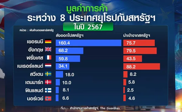 น่าสนใจว่า ยุโรปยังคงพึ่งพาสหรัฐฯ ในหลายด้าน ทั้งในด้านเศรษฐกิจและความมั่นคง โดยเฉพาะในด้านการค้า สหรัฐฯ เป็นหนึ่งในตลาดส่งออกสำคัญของ EU รวมถึง 8 ประเทศยุโรปที่ถูกขู่เก็บภาษีเพิ่มเติมด้วย ซึ่งเยอรมนีเป็นคู่ค้ารายใหญ่สุดในบรรดา 8 ชาติดังกล่าว ข้อมูลจากสำนักงานการค้าสหรัฐฯ ระบุว่า ในปี 2567 สหรัฐฯ และเยอรมนีมีมูลค่าการค้าทวิภาคี 2.36 แสนล้านดอลลาร์ โดยเยอรมนีส่งออกไปสหรัฐฯ 1.60 แสนล้านดอลลาร์ และนำเข้าจากสหรัฐฯ 7.57 หมื่นล้านดอลลาร์ ตามด้วยอังกฤษที่มีมูลค่าทวิภาคีกับสหรัฐฯ 1.47 แสนล้านดอลลาร์ แบ่งเป็นส่งออกไปยังสหรัฐฯ 6.82 หมื่นล้านดอลลาร์ และนำเข้าจากสหรัฐฯ 7.95 หมื่นล้านดอลลาร์