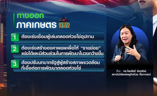 สำหรับ "ภาคเกษตร" ดร.โสมรัศมิ์ จันทรัตน์ ผู้อำนวยการ สถาบันวิจัยเศรษฐกิจป๋วย อึ๊งภากรณ์ ระบุว่า ภาคเกษตรไทยมีศักยภาพสูงในการต่อยอดโอกาสจากตลาดโลก แต่โอกาสเหล่านี้ก็มาพร้อมการแข่งขันที่เข้มข้นขึ้นเช่นกัน ที่ผ่านมาสินค้าเกษตรหลายกลุ่มสามารถปรับตัวและตอบรับโอกาสเหล่านี้ได้ โดยเฉพาะกลุ่มที่มีอุตสาหกรรมแปรรูปเข้มแข็งและมาตรฐานชัดเจน แต่การพัฒนายังจำกัดอยู่ในกลุ่มรายใหญ่ ขณะที่สินค้าเกษตรต้นน้ำกำลังสูญเสียความสามารถในการแข่งขันจากผลิตภาพที่ต่ำ ต้นทุนที่สูง และคุณภาพที่ไม่แตกต่างจากคู่แข่ง ส่งผลให้เกษตรกรส่วนใหญ่ยังคงมีรายได้ต่ำ แต่ต้องเผชิญความเสี่ยงสูงขึ้น และกว่าครึ่งเริ่มมีหนี้เกินศักยภาพในการชำระคืน จนกลายเป็นข้อจำกัดต่อการปรับตัว