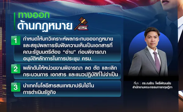 และด้าน "กฎหมาย" ดร.ณรัณ โพธิ์พัฒนชัย นักกฎหมายกฤษฎีกาชำนาญการพิเศษ ประจำกองกฎหมายการเงินการคลังและกองพัฒนากฎหมาย สำนักงานคณะกรรมการกฤษฎีกา ระบุว่ามุมมองเรื่องกฎหมายที่เน้นการพัฒนาระบบกฎหมาย เพื่อลดต้นทุนและเพิ่มขีดความสามารถของประเทศนั้น เป็นศาสตร์ใหม่ที่รวมหลายศาสตร์ทั้งด้านกฎหมาย เศรษฐศาสตร์ และสังคม ซึ่งเมื่อ 3 ปีที่แล้วพบว่า ระบบกฎหมายของไทยมี “ตะกรัน” ที่ค้างทอ ทำให้เป็นอุปสรรคสร้างต้นทุนมากเกินไป โดยเฉพาะต้นทุนเวลาของประชาชน และผู้ประกอบการในการติดต่อกับภาครัฐ