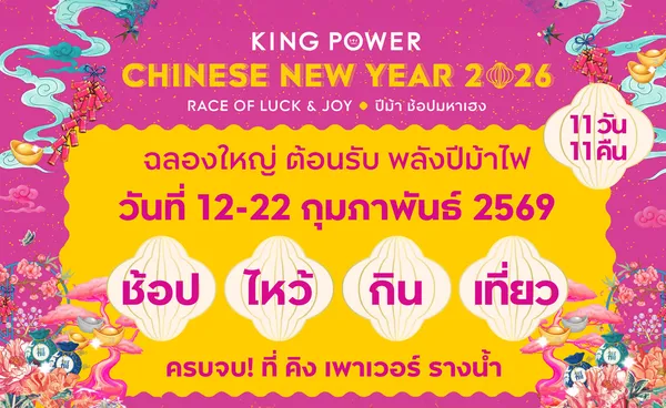 ร่วมเฉลิมฉลองเทศกาลตรุษจีนในงาน KING POWER CHINESE NEW YEAR 2026 RACE OF LUCK & JOY ปีม้า ช้อปมหาเฮง ตั้งแต่วันที่ 12 – 22 กุมภาพันธ์ 2569 ที่ คิง เพาเวอร์ รางน้ำ และภูเก็ต นอกจากนี้ ลูกค้าทุกท่านยังสามารถ ช้อปออนไลน์ พร้อมรับข้อมูลสิทธิพิเศษอื่น ๆ ได้ที่ WWW.KINGPOWER.COM และ KING POWER แอปพลิเคชัน สอบถามรายละเอียดเพิ่มเติมที่ KING POWER CONTACT CENTRE โทร. 1631