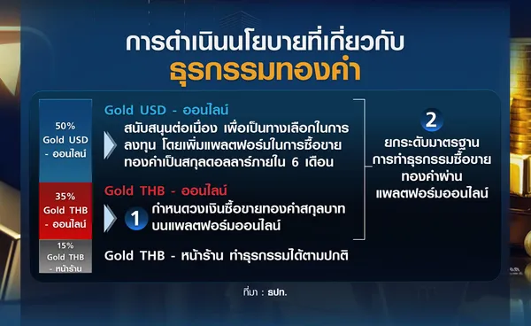 โดยธปท.ได้ออกมาตรการกำหนดการซื้อขายทองคำสกุลเงินบาทในแพลตฟอร์มออนไลน์เท่านั้น ซึ่งมีสัดส่วนประมาณร้อยละ 35 ของมูลค่าการซื้อขายทองคำทั้งหมด และยกระดับมาตรฐานการทำธุรกรรมซื้อขายทองคำผ่านแพลตฟอร์มออนไลน์ ส่วนการซื้อขายทองคำสกุลเงินดอลลาร์ในแพลตฟอร์มออนไลน์ ซึ่งมีสัดส่วนประมาณร้อยละ 50 ของมูลค่าการซื้อขายทองคำทั้งหมดนั้น ส่วนนี้ไม่มีผลกระทบต่อค่าเงินบาท ธปท.จึงยังสนับสนุนต่อเนื่องเพื่อเป็นทางเลือก สำหรับการซื้อขายทองคำผ่านหน้าร้านทองทั่วไปมีสัดส่วนประมาณร้อยละ 15 ของมูลค่าการซื้อขายทองคำทั้งหมดสามารถดำเนินธุรกรรมได้ตามปกติ
