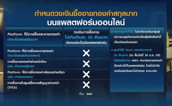 สำหรับรายละเอียดมาตรการกำหนดวงเงินการซื้อหรือขายทองคำนั้น ธปท.กำหนดให้การซื้อหรือขายทองคำต้องไม่เกินด้านละ 50 ล้านบาท/คน/ วัน /แพลตฟอร์ม โดยจะมีผลเฉพาะกับการซื้อขายทองคำบนแพลตฟอร์มที่ชำระเป็นสกุลบาทเท่านั้น ไม่ครอบคลุมการซื้อขายทองคำที่ชำระเป็นสกุลเงินดอลลาร์สหรัฐฯ การซื้อขายผ่านร้านทองทั่วไป รวมถึงการซื้อบนแพลตฟอร์มที่มีลักษณะออมทอง (ที่ไม่สามารถขายได้) หรือการซื้อขายในศูนย์ซื้อขายสัญญาล่วงหน้า (TFEX))