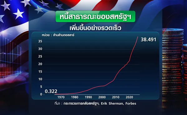 ข้อมูลจากกระทรวงการคลังสหรัฐฯ ระบุว่า นับถึงเดือนมกราคมปีนี้ หนี้สาธารณะของสหรัฐฯ อยู่ที่ 38.5 ล้านล้านดอลลาร์ คิดเป็นสัดส่วนเกือบร้อยละ 100 ของ GDP และคาดว่าภายในปี 2573 หนี้สาธารณะของสหรัฐฯ จะเพิ่มขึ้นเป็น 48.9 ล้านล้านดอลลาร์