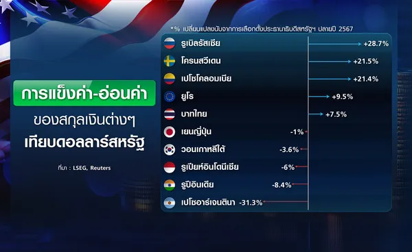 ในส่วนของเงินดอลลาร์สหรัฐแข็งค่าขึ้น รวมทั้งส่งสัญญาณทรงตัวหลังจากอ่อนค่าลงก่อนหน้านี้ โดยดัชนีดอลลาร์ ซึ่งวัดค่าเงินดอลลาร์เทียบกับตะกร้าสกุลเงินต่าง ๆ ปรับขึ้นร้อยละ 0.57 สู่ระดับ 96.73 ขณะที่เงินยูโรอ่อนค่าลงร้อยละ 0.54 สู่ระดับ 1.1904 ดอลลาร์ ข้อมูลจาก LSEG ระบุว่า เมื่อเทียบเงินดอลลาร์สหรัฐกับสกุลเงินอื่น ๆ เงินรูเบิลของรัสเซียแข็งค่าขึ้นมากสุดร้อยละ 28.7 นับตั้งแต่เลือกตั้งประธานาธิบดีสหรัฐฯ เมื่อปลายปี 2567 ตามด้วยโครนสวีเดนแข็งค่าร้อยละ 21.5 ใกล้เคียงกับเปโซโคลอมเบียที่แข็งค่าร้อยละ 21.4 ขณะเงินยูโรแข็งค่าขึ้นร้อยละ 9.5 ส่วนบาทไทยแข็งค่าร้อยละ 7.5 ขณะที่สกุลเงินที่อ่อนค่าลงมากสุดเมื่อเทียบดอลลาร์ คือ เปโซอาร์เจนตินาอ่อนค่าลงร้อยละ 31.3 ด้านรูปีอินเดียอ่อนค่าร้อยละ 8.4 ส่วนวอนเกาหลีใต้อ่อนค่าร้อยละ 3.6 และเยนญี่ปุ่นอ่อนค่าร้อยละ 1