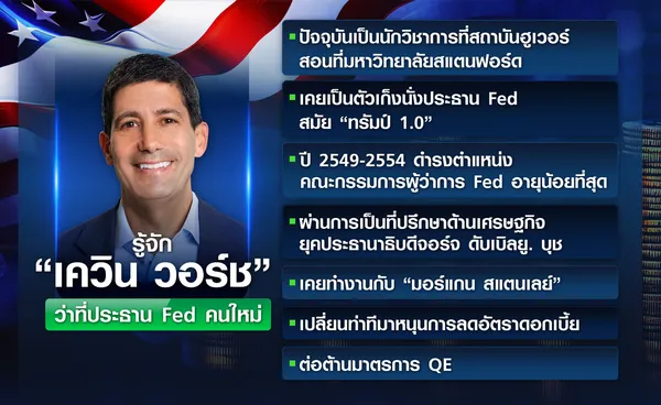 ประธานาธิบดีโดนัลด์ ทรัมป์ ของสหรัฐฯ ประกาศเสนอชื่อ “เควิน วอร์ช” วัย 55 ปี ให้นั่งเก้าอี้ประธานธนาคารกลางสหรัฐฯ (เฟด) คนใหม่ ต่อจาก “เจอโรม พาวเวลล์” ที่กำลังจะหมดวาระในเดือนพฤษภาคมปีนี้ โดย “วอร์ช” ไม่ใช่หน้าใหม่ในแวดวงการเงิน เขาเคยเป็นสมาชิกคณะกรรมการผู้ว่าการ (Board of Governors) ของเฟดในระหว่างปี 2549-2554 และถือเป็นผู้ว่าการเฟดที่อายุน้อยสุดในประวัติศาสตร์สหรัฐฯ จากการได้รับแต่งตั้งเมื่ออายุ 35 ปี รวมทั้งก่อนหน้านั้นเคยเป็นที่ปรึกษาด้านเศรษฐกิจสมัยรัฐบาลของประธานาธิบดีจอร์จ ดับเบิลยู. บุช แห่งพรรครีพับลิกัน และเคยทำงานที่สถาบันการเงินระดับโลก “มอร์แกน สแตนเลย์” ปัจจุบัน เขาเป็นนักวิชาการอยู่ที่สถาบันฮูเวอร์และสอนที่บัณฑิตวิทยาลัยธุรกิจแห่งมหาวิทยาลัยสแตนฟอร์ด