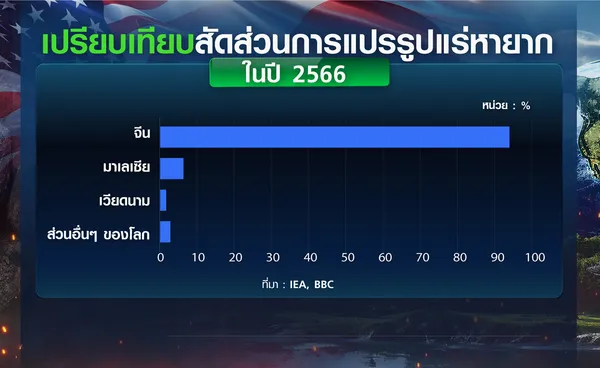 ข้อมูลจากองค์การพลังงานระหว่างประเทศ (IEA) ระบุว่า ในปี 2566 จีนผลิตแร่หายากคิดเป็นสัดส่วนร้อยละ 61 ของทั้งโลก และแปรรูปในสัดส่วนร้อยละ 92 ของทั้งโลก ส่วนข้อมูลจากสำนักงานสำรวจธรณีวิทยาของสหรัฐฯ (USGS) เผยว่า ในปี 2567 จีนผลิตแร่หายากได้ราว 270,000 ตัน เมื่อเทียบกับสหรัฐฯ ที่อยู่ที่ 45,000 ตัน หรือมากกว่ากันประมาณ 6 เท่า