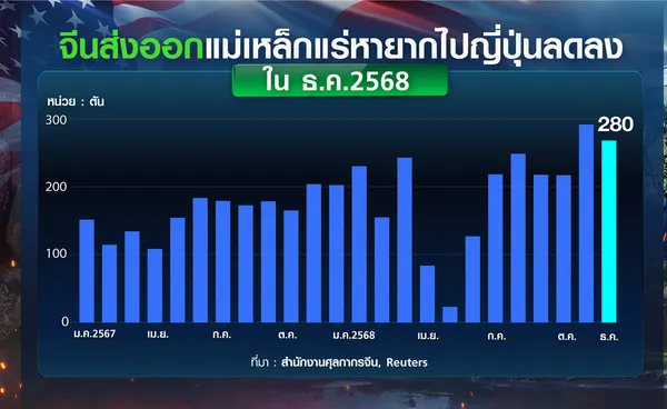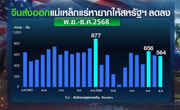 ข้อมูลจาก “รอยเตอร์ส” ระบุว่า ในเดือนธันวาคมปีที่แล้ว จีนส่งออกแม่เหล็กแร่หายากไปยังสหรัฐฯ ลดลงร้อยละ 3 เมื่อเทียบกับเดือนพฤศจิกายน อยู่ที่ 564 ตัน ซึ่งเป็นการลดลงต่อเนื่อง 2 เดือนติด ในขณะที่ตลอดทั้งปี 2568 การส่งออกแม่เหล็กจากจีนไปสหรัฐฯ อยู่ที่ 5,933 ตัน ลดลงราวร้อยละ 20.3 เมื่อเทียบกับปีก่อนหน้า น่าสังเกตว่า การส่งออกแม่เหล็กแสดงการฟื้นตัวหลังจากจีนตกลงระงับมาตรการควบคุมการส่งออกบางส่วน หลังจากการประชุมระหว่างประธานาธิบดีสี จิ้นผิง ของจีน และประธานาธิบดีทรัมป์ เมื่อเดือนตุลาคม