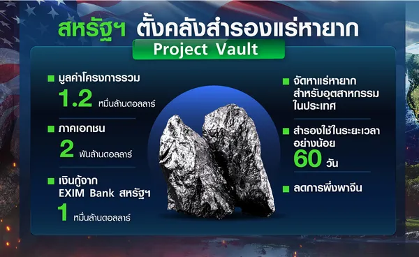 ประธานาธิบดีโดนัลด์ ทรัมป์ ของสหรัฐฯ เพิ่งประกาศตั้งคลังสำรองแร่สำคัญและแร่หายาก (rare earth) โดยใช้ชื่อว่า “โครงการวอลต์” (Project Vault) ซึ่งเป็นการระดมทุนจากภาคเอกชนราว 2 พันล้านดอลลาร์ และภาครัฐอีก 1 หมื่นล้านดอลลาร์ ผ่านการปล่อยกู้ของธนาคารเพื่อการส่งออกและนำเข้า (Export-Import Bank) สำหรับจัดหาแร่หายากต่าง ๆ ไว้รองรับอุตสาหกรรมต่าง ๆ โดยเฉพาะการจัดหาแร่หายากไว้ใช้ในภาวะฉุกเฉินได้เป็นเวลานาน 60 วัน คล้าย ๆ กับที่สหรัฐฯ มีคลังน้ำมันดิบสำรองเชิงยุทธศาสตร์