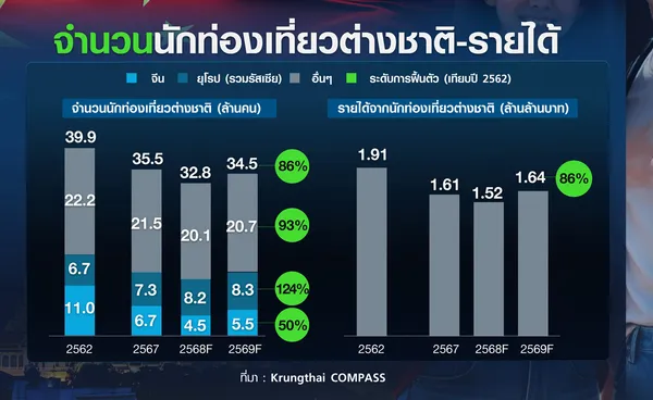 ดังนั้น Krungthai COMPASS จึงประเมินว่า ในปี 2569 ทั้งจำนวน และรายได้จากนักท่องเที่ยวต่างชาติจะยังไม่กลับไปเท่าระดับก่อนโควิด โดยจำนวนนักท่องเที่ยวต่างชาติคาดอยู่ที่ราว 34.5 ล้านคน (คิดเป็นร้อยละ 86 ของปี 2562) และรายได้ราว 1.64 ล้านล้านบาท (ร้อยละ 86 ของปี 2562)