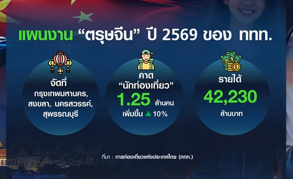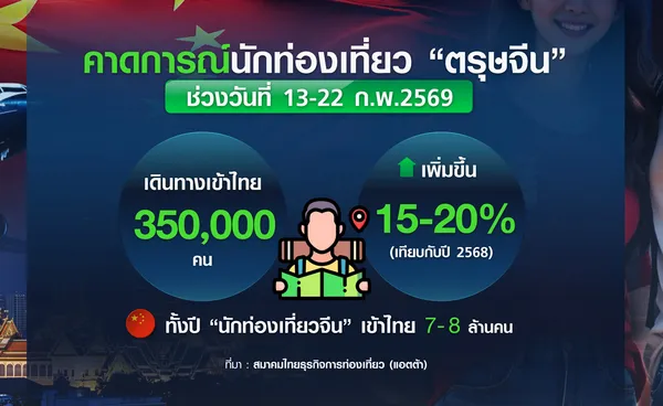 โดยระบุว่า คาดว่สาแนวโน้มเทศกาลตรุษจีนปี 2569 ระหว่างวันที่ 13-22 ก.พ. นี้ ในช่วง 10 วันนี้ จะมีชาวจีนเดินทางเข้าไทยรวมประมาณ 350,000 คน หรือเฉลี่ย 17,000 – 18,000 คนต่อวัน เพิ่มขึ้นจากปีที่แล้วราวร้อยละ 15-20