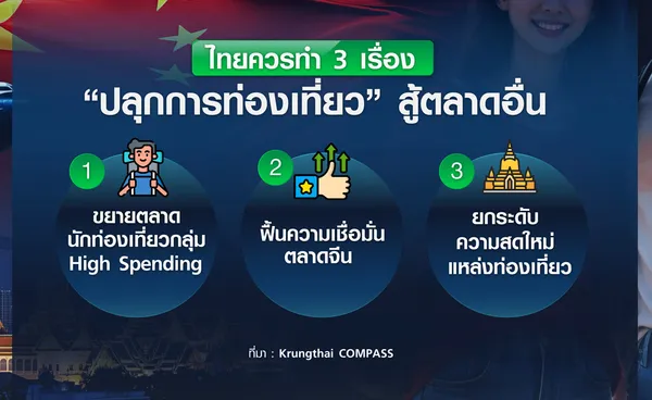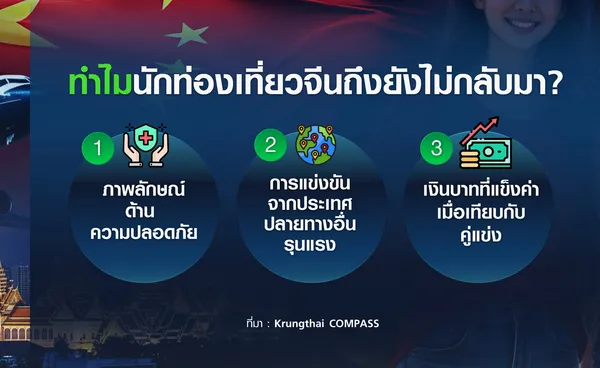 ส่วนปัจจัยที่ทำนัก “ท่องเที่ยวจีน” ที่ยังไม่กลับมาเที่ยวไทย Krungthai COMPASS มองว่ามาจาก 3 สาเหตุหลัก ประกอบด้วย