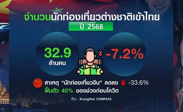 ความขัดแย้งระหว่างไทย-กัมพูชาที่ทวีความรุนแรงขึ้นและลากยาวมาถึงในปีนี้ รวมถึงสถานการณ์น้ำท่วมในภาคใต้ รวมถึงค่าเงินบาทที่มีทิศทางแข็งค่า ส่งผลให้ในปี 2568 มีจำนวนนักท่องเที่ยวต่างชาติที่เดินทางเข้าไทยราว 32.9 ล้านคน ติดลบร้อยละ 7.2 และยังฟื้นตัวได้เพียงร้อยละ 82 เมื่อเทียบกับช่วงก่อนโควิดในปี 2562 โดยสาเหตุหลักมาจากนักท่องเที่ยวจีนที่ลดลงถึง ร้อยละ -33.6 และยังฟื้นตัวได้เพียงร้อยละ 40 ของช่วงก่อนโควิดเท่านั้น