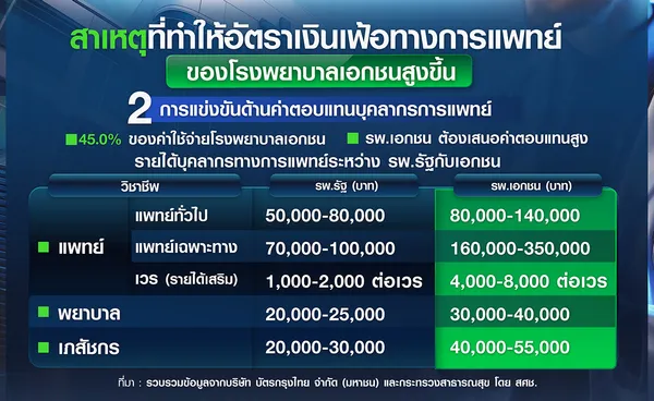 ค่าตอบแทนบุคลากรการแพทย์ โรงพยาบาลเอกชนเสนอค่าตอบแทนบุคลากรสูงถือเป็นปัจจัยสำคัญที่ผลักดันให้ต้นทุนการให้บริการโรงพยาบาลปรับสูงขึ้น โดยในปี 2568 พบว่าค่าธรรมเนียมแพทย์และค่าบริการทางวิชาชีพยังคงเป็นรายการค่าใช้จ่ายที่มีสัดส่วนสูงที่สุด คิดเป็นร้อยละ 45.0 ของค่าใช้จ่ายทั้งหมดหรือเกือบครึ่งหนึ่งของค่ารักษาพยาบาล