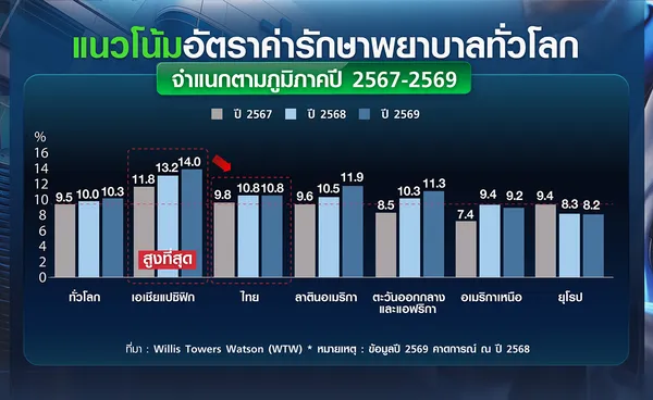 ภูมิภาคเอเชียแปซิฟิกยังคงเป็นภูมิภาคที่มีอัตราเงินเฟ้อทางการแพทย์สูงที่สุด โดยคาดว่าจะอยู่ที่ร้อยละ 14.0 ในปี 2569 เพิ่มขึ้นจากร้อยละ 13.2 ในปี 2568 ทั้งนี้ มากกว่าครึ่งหนึ่งของบริษัทประกันประเมินว่า ระดับค่าใช้จ่ายที่สูงนี้จะยืดเยื้อต่อเนื่องนานเกินกว่า 3 ปี ขณะที่ประเทศไทยมีอัตราเงินเฟ้อทางการแพทย์ อยู่ที่ร้อยละ 10.8 ในปี 2568 สูงกว่าอัตราเงินเฟ้อทั่วไป ที่ร้อยละ 0.7 ในปี 2568 กว่า 15 เท่า