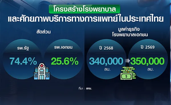 รองเลขาธิการสภาพัฒน์ระบุว่า เมื่อพิจารณาโครงสร้างโรงพยาบาลและศักยภาพการให้บริการทางการแพทย์ในประเทศไทย พบว่า ปัจจุบันมีโรงพยาบาลรวมทั้งสิ้น 1,491 แห่ง แบ่งเป็นโรงพยาบาลรัฐ 1,110 แห่ง คิดเป็นร้อยละ 74.4 ของโรงพยาบาลทั้งหมด และโรงพยาบาลเอกชน 381 แห่ง คิดเป็นร้อยละ 25.6 แม้โรงพยาบาลรัฐจะมีจำนวนมากกว่า แต่ยังเผชิญข้อจำกัดในการรองรับความต้องการ โดยเฉพาะในพื้นที่ที่มีประชากรหนาแน่น ซึ่งมีภาระการดูแลผู้ป่วยตามสิทธิหลักประกันสุขภาพถ้วนหน้าจำนวนมาก ส่งผลให้เกิดความแออัดและระยะเวลารอคอยการรักษาหรือการผ่าตัดที่ยาวนาน