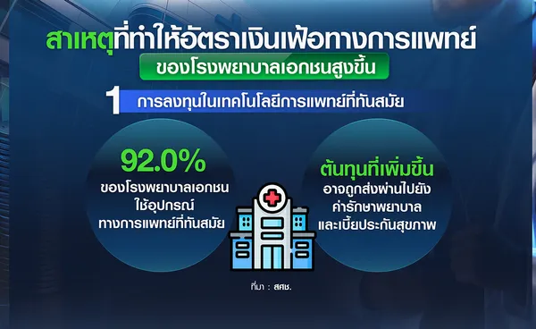 สาเหตุที่ทำให้อัตราเงินเฟ้อทางการแพทย์ของโรงพยาบาลเอกชนสูงขึ้น อย่างแรกคือ (1) ความก้าวหน้าของเทคโนโลยีการแพทย์มีบทบาทสำคัญในการผลักดันให้ต้นทุนค่ารักษาพยาบาลเพิ่มสูงขึ้น โดยโรงพยาบาลเอกชนมีการลงทุนในเทคโนโลยีการแพทย์ที่ทันสมัย