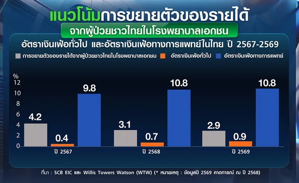 อย่างไรก็ดี หากพิจารณาโครงสร้างการเติบโตจะพบว่า รายได้จากกลุ่มผู้ป่วยชาวไทยมีแนวโน้มขยายตัวในอัตราที่ชะลอลง โดยในปี 2569 คาดว่าเติบโตประมาณร้อยละ 2.9 เมื่อเทียบกับปีก่อน แต่อัตราเงินเฟ้อทางการแพทย์ของประเทศไทยไม่ได้ลดลง เนื่องจากกลุ่มผู้ใช้ประกันสุขภาพเอกชนพบการขยายตัวต่อเนื่อง สะท้อนให้เห็นอย่างชัดเจนผ่านอัตราเงินเฟ้อทางการแพทย์ของประเทศไทย ซึ่งอยู่ที่ร้อยละ 10.8 ในปี 2568 และคาดการณ์ว่าจะยังอยู่ในระดับใกล้เคียงกันในปี 2569 โดยสูงกว่าอัตราเงินเฟ้อทั่วไปของประเทศ ซึ่งอยู่ที่ร้อยละ 0.7 ในปี 2568 และคาดว่าจะอยู่ที่ร้อยละ 0.9 ในปี 2569 อย่างมีนัยสำคัญ
