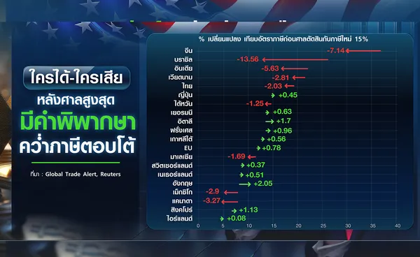 จากการวิเคราะห์ของ Global Trade Alert พบว่า เมื่อพิจารณาตามน้ำหนักการค้าเปรียบเทียบอัตราภาษีก่อนศาลตัดสินกับภาษีใหม่ร้อยละ 15 พบว่า บางประเทศที่เคยได้อัตราภาษีในระดับต่ำกลับต้องจ่ายเพิ่มขึ้น และบางประเทศก็ได้ประโยชน์จากการที่ภาษีลดลง โดยอังกฤษที่ตกลงภาษีกับสหรัฐฯ ที่ระดับร้อยละ 10 จะเผชิญกับการเพิ่มขึ้นของภาษีเฉลี่ยร้อยละ 2.05 ส่วน EU เพิ่มขึ้นร้อยละ 0.8 ขณะที่บราซิลลดลงร้อยละ 13.6 และจีนลดลงร้อยละ 7.1 ประเทศในอาเซียนอย่างเวียดนามลดลงร้อยละ 2.81 ส่วนไทยลดลงร้อยละ 2.03 และมาเลเซียลดลงร้อยละ 1.69