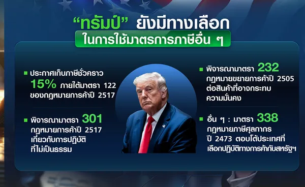 นอกเหนือจากมาตรา 122 แล้ว รัฐบาลของประธานาธิบดีทรัมป์ยังมีทางเลือกอื่น ๆ ในการใช้มาตรการภาษีได้ ไม่ว่าจะเป็น มาตรา 301 ภายใต้กฎหมายการค้าปี 2517 เกี่ยวกับการปฏิบัติที่ไม่เป็นธรรม อาทิ การเลือกปฏิบัติกับบริษัทเทคโนโลยีสหรัฐฯ แต่จะต้องมีการสอบสวนอย่างเป็นทางการจากผู้แทนการค้าสหรัฐฯ (USTR) รวมถึงมาตรา 232 กฎหมายขยายการค้าปี 2505 เกี่ยวกับสินค้าที่อาจกระทบความมั่นคง อาทิ ภาษีในกลุ่มเหล็ก อะลูมิเนียม และรถยนต์ ซึ่งยังมีผลบังคับใช้อยู่ ขณะเดียวกันก็มีมาตราอื่น ๆ อาทิ มาตรา 338 ของกฎหมายภาษีศุลกากรปี 2473 (1930) หรือที่มีชื่อเล่นว่า “สมูท-ฮอว์ลีย์” (Smoot-Hawley) ซึ่งเรียกเก็บภาษีได้ในอัตราร้อยละ 50 เพื่อตอบโต้ประเทศที่เลือกปฏิบัติทางการค้ากับสหรัฐฯ และมาตรา 201 ของกฎหมายการค้าปี 2517 ที่สามารถเก็บภาษีศุลกากรเพื่อปกป้องการนำเข้าที่ทำให้เกิดความเสียหายร้ายแรงต่ออุตสาหกรรมในประเทศ ยังไม่นับรวมมาตรการที่ไม่ใช่ภาษี (non-tariff barrier) อีกหลายเรื่อง