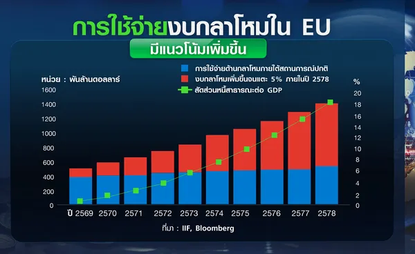 แต่แผนการเพิ่มงบประมาณด้านกลาโหมและความมั่นคงของสหภาพยุโรป (EU) เป็นร้อยละ 5 ของ GDP ภายในปี 2578 ตามแรงกดดันของประธานาธิบดีโดนัลด์ ทรัมป์ แห่งสหรัฐฯ อาจทำให้สัดส่วนหนี้ภาครัฐเพิ่มขึ้นมากกว่าร้อยละ 18 ต่อ GDP เว้นแต่ว่าการระดมทุนภาคเอกชนเพื่อสนับสนุนโครงการพัฒนาต่าง ๆ จะเร่งตัวขึ้น