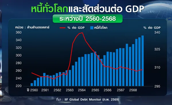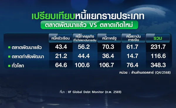 สถาบันการเงินระหว่างประเทศ (IIF) เผยแพร่รายงาน Global Debt Monitor ฉบับล่าสุดเดือนกุมภาพันธ์ ระบุว่า นับถึงไตรมาส 4 ปี 2568 หนี้ทั่วโลกเร่งตัวขึ้นรวดเร็วที่สุดนับตั้งแต่วิกฤตโควิด โดยยอดหนี้ทั่วโลกที่ประกอบด้วยหนี้ภาครัฐ ภาคครัวเรือน ภาคธุรกิจ และสถาบันการเงิน พุ่งแตะระดับสูงสุดเป็นประวัติการณ์ที่ 348.3 ล้านล้านดอลลาร์ แบ่งเป็นหนี้ในตลาดพัฒนาแล้ว 231.7 ล้านล้านดอลลาร์ และตลาดเกิดใหม่อยู่ที่ 116.6 ล้านล้านดอลลาร์ ซึ่งเพิ่มขึ้นถึง 28.8 ล้านล้านดอลลาร์ เมื่อเทียบกับ 319.5 ล้านล้านดอลลาร์ในช่วงเดียวกันของปีก่อนหน้า ในจำนวนหนี้ที่เพิ่มขึ้นราว 2 ใน 3 มาจากประเทศพัฒนาแล้วที่ใช้นโยบายขาดดุลงบประมาณอย่างต่อเนื่อง