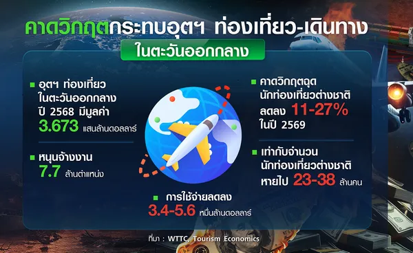 นอกเหนือจากอุตสาหกรรมน้ำมันและก๊าซธรรมชาติที่ได้รับผลกระทบอย่างหนักจากการปะทะในภูมิภาค อุตสาหกรรมการท่องเที่ยวและเดินทางเป็นอีกภาคส่วนที่น่าจะได้รับผลกระทบรุนแรงไม่แพ้กัน สภาการเดินทางและการท่องเที่ยวโลก (World Travel and Tourism Council-WTTC) ประเมินว่า ในปี 2568 อุตสาหกรรมการเดินทางและท่องเที่ยวในตะวันออกกลาง มีมูลค่าราว 3.673 แสนล้านดอลลาร์ และมีส่วนช่วยสนับสนุนการจ้างงานราว 7.7 ล้านตำแหน่ง โดยนักท่องเที่ยวต่างชาติใช้จ่ายเงินในการเดินทางและท่องเที่ยวเกือบ 1.94 แสนล้านดอลลาร์ ในปีที่แล้ว เพิ่มขึ้นร้อยละ 24 เมื่อเทียบกับระดับก่อนวิกฤตโควิดในปี 2562