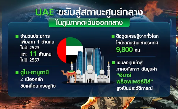น่าสนใจว่า UAE กำลังเดิมพันสถานะ “ฮับ” สูงกว่าประเทศอื่น ๆ เพราะกำลังเผชิญบททดสอบสำคัญ หลังจาก 4 ทศวรรษที่ผ่านมา UAE สร้างชื่อเสียงในฐานะดินแดนแห่งโอกาสทางธุรกิจ แหล่งพำนักหรูหราของบรรดามหาเศรษฐีทั่วโลกที่ย้ายถิ่นฐานเข้าประเทศกว่า 9,800 คน รวมทั้งดึงดูดเม็ดเงินจากต่างประเทศผ่านทางการค้า การท่องเที่ยว อสังหาริมทรัพย์ระดับไฮเอนด์ และบริการทางการเงินที่ทันสมัย ปัจจุบัน จำนวนประชากรใน UAE เพิ่มจาก 1 ล้านคนในปี 2523 แตะที่ 11 ล้านคนในปี 2567 ประมาณร้อยละ 90 เป็นชาวต่างชาติ
