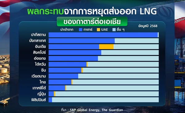 “เดอะ การ์เดียน” อ้างอิงข้อมูลจาก S&P Global Energy ระบุว่า การหยุดส่งออก LNG ของกาตาร์ส่งผลกระทบต่อหลายประเทศในเอเชีย โดยเฉพาะปากีสถานที่ในปีที่แล้วนำเข้า LNG เกือบทั้งหมดจากกาตาร์ ขณะที่ไทยก็นำเข้า LNG จากกาตาร์ในสัดส่วนร้อยละ 21 ของการนำเข้าทั้งหมด ด้าน “ซาอัด อัล-คาบี” รัฐมนตรีพลังงานของกาตาร์ กล่าวกับหนังสือพิมพ์ไฟแนนเชียลไทมส์ว่า อาจต้องใช้เวลานานหลายสัปดาห์หรือหลายเดือน กว่าที่การจัดส่งพลังงานจะกลับสู่ภาวะปกติ แม้ว่าสงครามจะยุติลงในวันนี้ก็ตาม