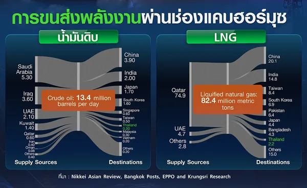 ในปัจจุบันไทยนำเข้า LNG ผ่านช่องแคบฮอร์มุซประมาณ 2.2 ล้านตันต่อปี หรือคิดเป็น 24% ของการนำเข้า LNG ทั้งหมด ซึ่งการปิดช่องแคบนี้จะส่งผลกระทบต่อเชื้อเพลิงหลักในการผลิตไฟฟ้าของประเทศ