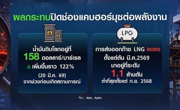 สถานการณ์ดังกล่าวส่งผลให้ราคาน้ำมันในตลาดโลกปรับตัวเพิ่มขึ้นอย่างมีนัยสำคัญ โดยราคาน้ำมันดิบดูไบ ณ วันที่ 20 มีนาคม 2569 อยู่ที่ 158 ดอลลาร์สหรัฐต่อบาร์เรล เพิ่มขึ้นประมาณ 122% จากช่วงก่อนเกิดสถานการณ์ ซึ่งเป็นการปรับตัวที่มีนัยสำคัญต่อระบบพลังงานโลก