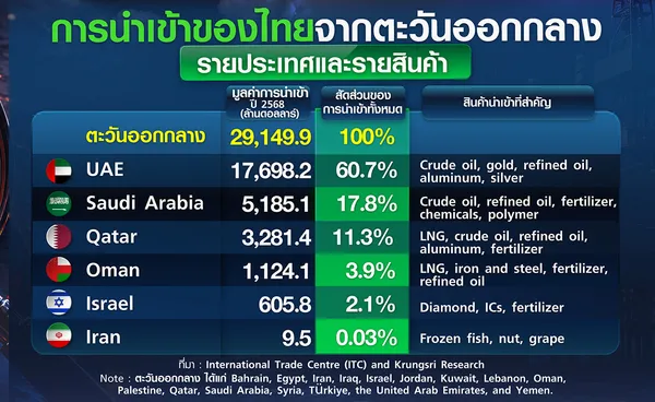 2) การหยุดชะงักของปัจจัยการผลิตนำเข้า ในปี 2568 มูลค่าการนำเข้าของไทยจากตะวันออกกลางอยู่ที่ 29,150 ล้านดอลลาร์สหรัฐ คิดเป็น 8.3% ของการนำเข้าทั้งหมดของไทย