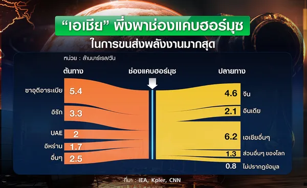 ความขัดแย้งในตะวันออกกลางทำให้ช่องแคบฮอร์มุซถูกปิด ส่งผลให้น้ำมันดิบร้อยละ 20 ของทั้งโลกไม่สามารถขนส่งผ่านเส้นทางนี้ได้ โดยองค์การพลังงานระหว่างประเทศ (IEA) วิเคราะห์ข้อมูลของ “เคปเลอร์” (Kpler) พบว่า ในปี 2568 ผู้ส่งออกน้ำมันรายใหญ่สุดผ่านช่องแคบฮอร์มุซ คือ ซาอุดีอาระเบีย ราว 5.4 ล้านบาร์เรลต่อวัน ตามด้วยอิรัก 3.3 ล้านบาร์เรลต่อวัน, UAE 2 ล้านบาร์เรลต่อวัน, อิหร่าน 1.7 ล้านบาร์เรลต่อวัน และประเทศอื่น ๆ รวมกัน 2.5 ล้านบาร์เรลต่อวัน ขณะที่น้ำมันร้อยละ 80 ในจำนวนนี้มีจุดหมายปลายทางในเอเชีย ได้แก่ จีน 4.6 ล้านบาร์เรลต่อวัน ตามด้วยอินเดีย 2.1 ล้านบาร์เรลต่อวัน ส่วนประเทศอื่น ๆ ในเอเชีย รวม 6.2 ล้านบาร์เรลต่อวัน