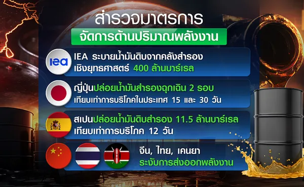 ในด้านการระบายน้ำมันสำรองเชิงยุทธศาสตร์ สมาชิก 32 ประเทศของ IEA ลงมติระบายน้ำมันดิบจากคลังสำรองเชิงยุทธศาสตร์ ราว 400 ล้านบาร์เรลเข้าสู่ตลาด นับเป็นครั้งใหญ่ที่สุดในรอบ 50 ปี และการปล่อยน้ำมันสำรองรอบแรกนี้คิดเป็นสัดส่วนราวร้อยละ 33 ของปริมาณน้ำมันสำรองเชิงยุทธศาสตร์ทั้งหมดในส่วนของภาครัฐราว 1.2 พันล้านบาร์เรล และยังมีน้ำมันสำรองฉุกเฉินภาคเอกชน 600 ล้านบาร์เรล