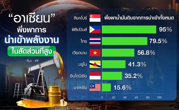ขณะที่อาเซียนมีความเปราะบางในเรื่องการพึ่งพาพลังงานจากต่างประเทศ ซึ่งส่วนใหญ่มาจากตะวันออกกลาง ข้อมูลจาก “ไฟแนนเชียล ไทมส์” ระบุว่า สิงคโปร์พึ่งพาน้ำมันดิบจากการนำเข้าทั้งหมด รองลงมาคือฟิลิปปินส์ที่นำเข้าร้อยละ 95 ตามด้วยไทยนำเข้าร้อยละ 79.5, เวียดนาม ร้อยละ 56.8, บรูไนพึ่งพาการนำเข้าร้อยละ 41.3 ส่วนอินโดนีเซียพึ่งพาการนำเข้าร้อยละ 35.2 และมาเลเซียพึ่งพาน้อยกว่า อยู่ที่ร้อยละ 15.6