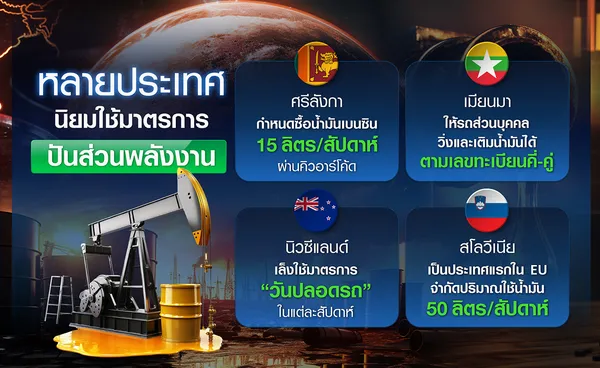 การปันส่วนพลังงานมีหลายรูปแบบ อย่างกรณีของ “ศรีลังกา” กำหนดให้สามารถซื้อน้ำมันเบนซินได้เพียง 15 ลิตรต่อสัปดาห์ ผ่านระบบคิวอาร์โค้ด ส่วน “เมียนมา” กำหนดให้รถส่วนบุคคลวิ่งและเติมน้ำมันได้ตามเลขทะเบียนวันคี่-คู่ ยกเว้นรถสาธารณะและรถยนต์ไฟฟ้า (EV) ด้าน “นิวซีแลนด์” รัฐบาลพิจารณาใช้มาตรการ “วันปลอดรถ” (car-free day) ซึ่งผู้ขับขี่สามารถเลือกวันที่จะไม่ขับรถในแต่ละสัปดาห์ได้ ส่วน “สโลวีเนีย” เป็นประเทศแรกในสหภาพยุโรป (EU) ที่เริ่มรับมือวิกฤตพลังงาน โดยผู้ขับขี่จะถูกจำกัดปริมาณการใช้น้ำมันไว้ที่ 50 ลิตรต่อสัปดาห์ ในขณะที่ภาคธุรกิจและเกษตรกรจำกัดไว้ที่ 200 ลิตร