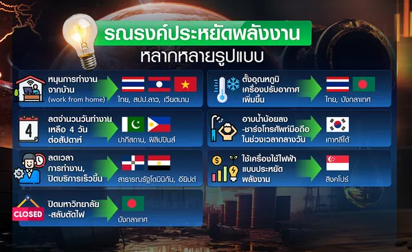 มาตรการประหยัดพลังงานเป็นอีกหนึ่งแนวทางที่หลายประเทศหยิบยกขึ้นมาใช้ในเวลานี้ อาทิ การสนับสนุนให้ผู้คนทำงานจากบ้าน (work from home) อย่างกรณีของไทยที่รัฐบาลสั่งให้หน่วยงานราชการและรัฐวิสาหกิจที่ไม่เกี่ยวกับบริการประชาชนทำงานจากบ้าน เช่นเดียวกับหลายประเทศในเอเชีย อาทิ สปป.ลาวที่ให้เจ้าหน้าที่รัฐทำงานจากบ้าน ส่วนเวียดนามที่เรียกร้องให้ภาคธุรกิจหันมาทำงานจากระยะไกลมากขึ้น