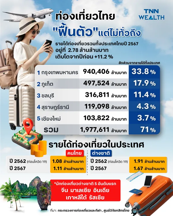 เนื่องจากรายได้ท่องเที่ยวรวมทั้งประเทศไทยปี 2567 อยู่ที่ 2.78 ล้านล้านบาท เติบโตจากปีก่อน +11.2 %
