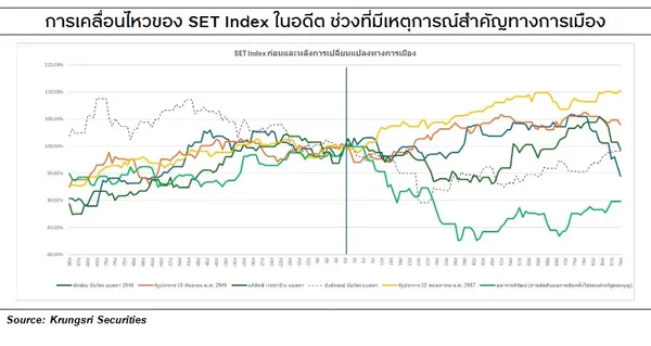 ผลกระทบต่อตลาดหุ้นไทย(SET Index) KSS ประเมิน SET ที่เริ่มสะท้อนความกังวลการเมืองตั้งแต่ 13 พ.ค. และปรับตัวลงแล้ว -10% น่าจะสะท้อนความเสี่ยงการเมืองไปพอสมควรแล้วหากอิงสถิติการเคลื่อนไหวในอดีต ช่วงที่มีสถานการณ์การเมืองที่คล้ายกัน คือ เหตุการณ์ยุบสภา ฯลฯ อาทิ