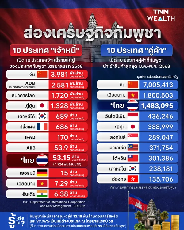 เปิด 10 ประเทศเจ้าหนี้รายใหญ่ของประเทศกัมพูชา ไตรมาสแรก 2568